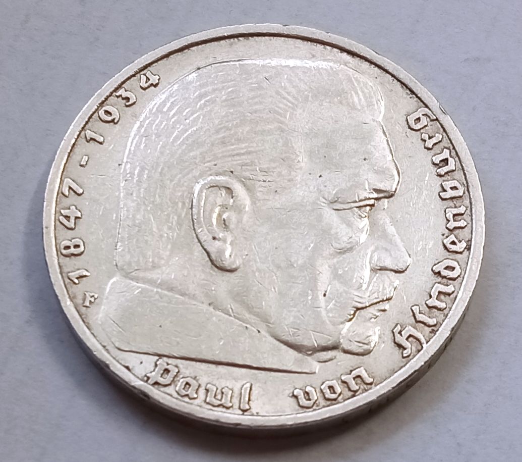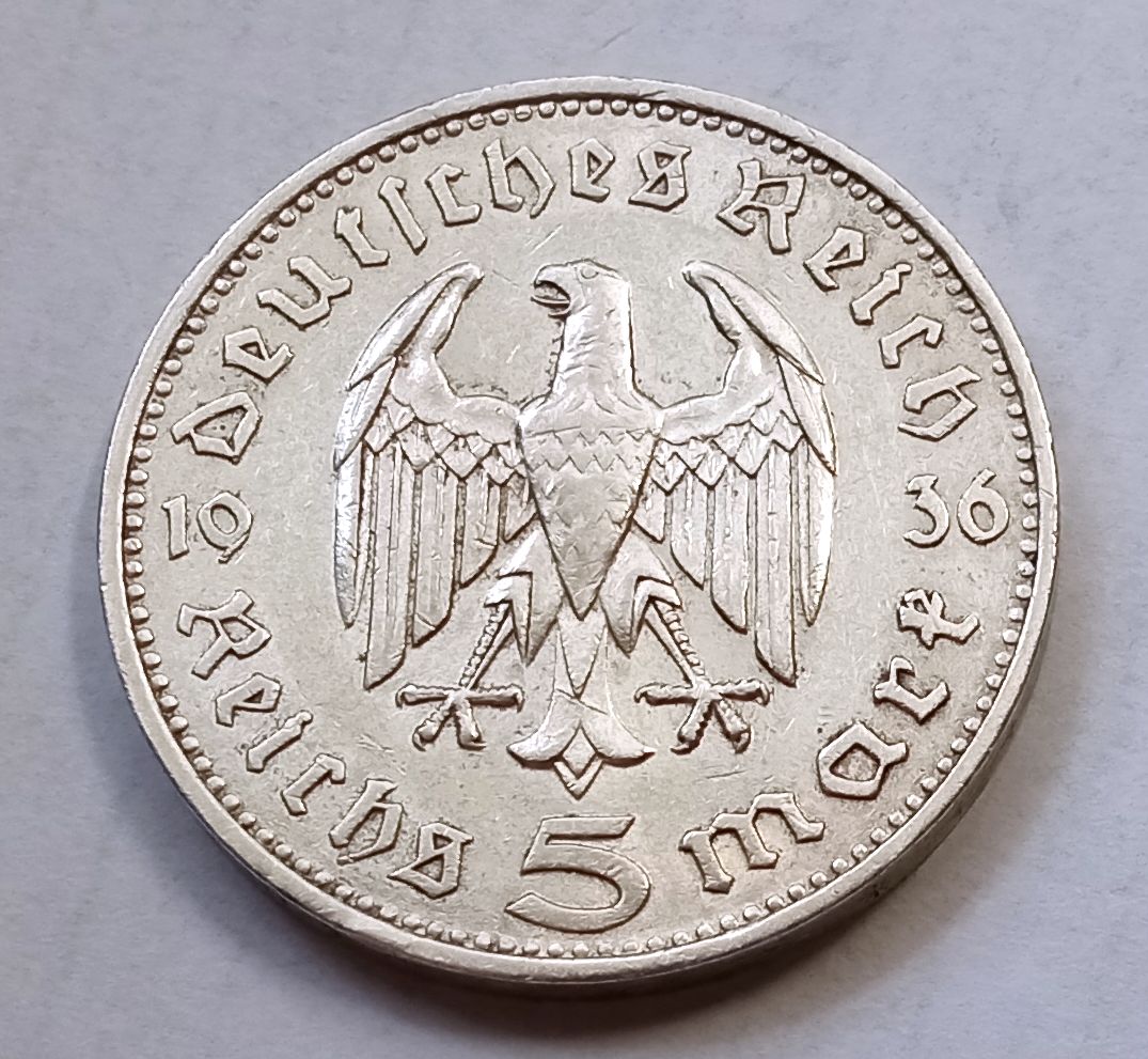 1936 F, NÉMETORSZÁG, III. BIRODALMI EZÜST 5 MÁRKA!