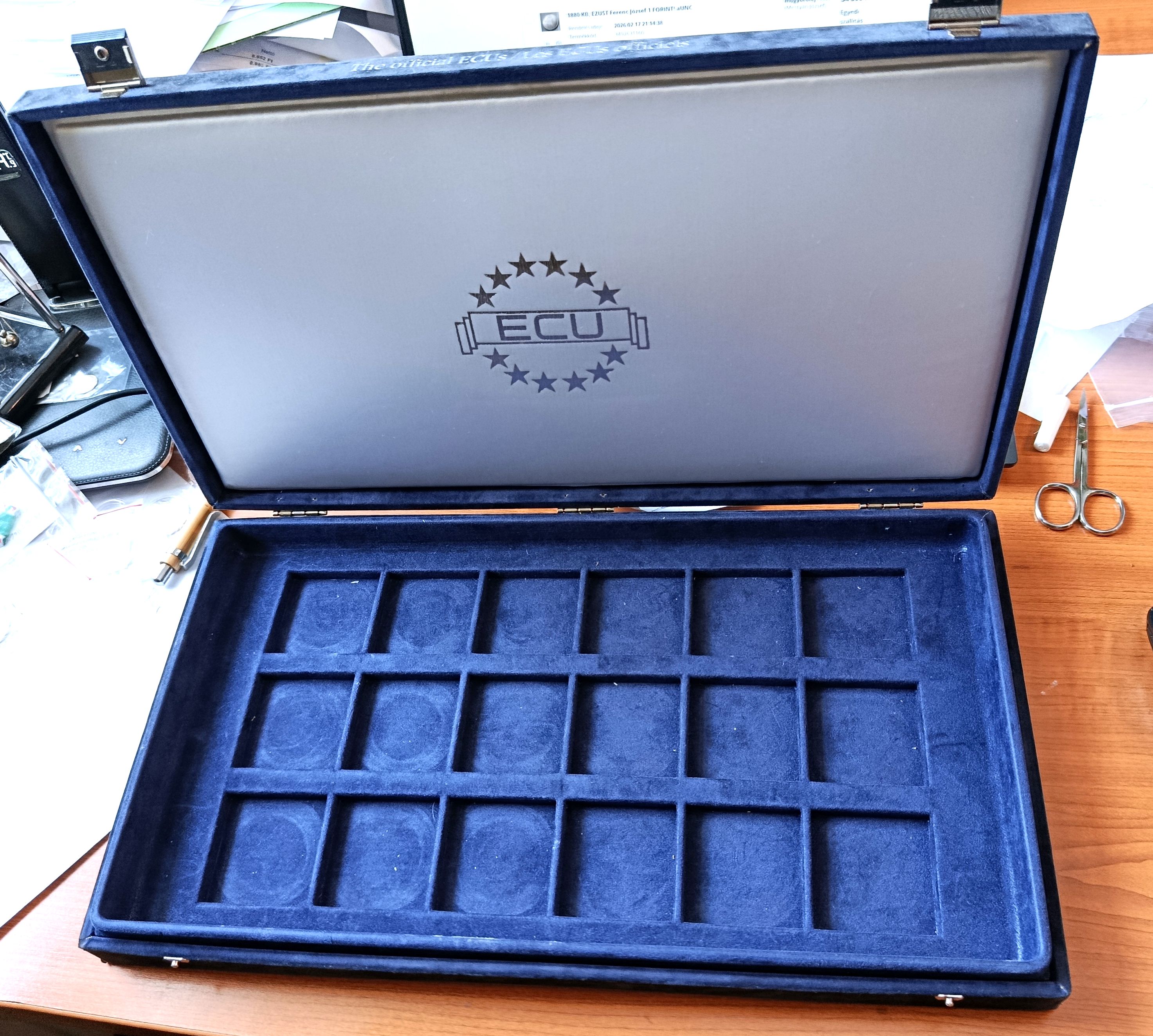 SZÉP KIVITELŰ, BÁRSONYBŐR BORÍTÁSÚ, 1 TÁLCÁS, 18 DB, NAGYMÉRETŰ ÉRME TÁROLÁSÁRA ALKALMAS.